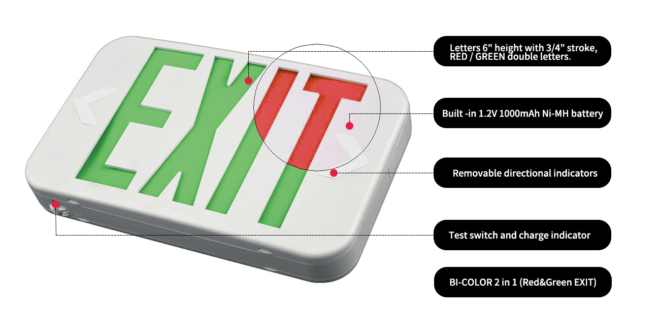 Un semn simplu, eficient și sigur de ieșire listat UL cu litere cu LED-uri roșii sau verzi de 6 ". Economisiți bani cumpărând acest produs 2-in-1. Baterie NI-CAD cu întreținere scăzută.