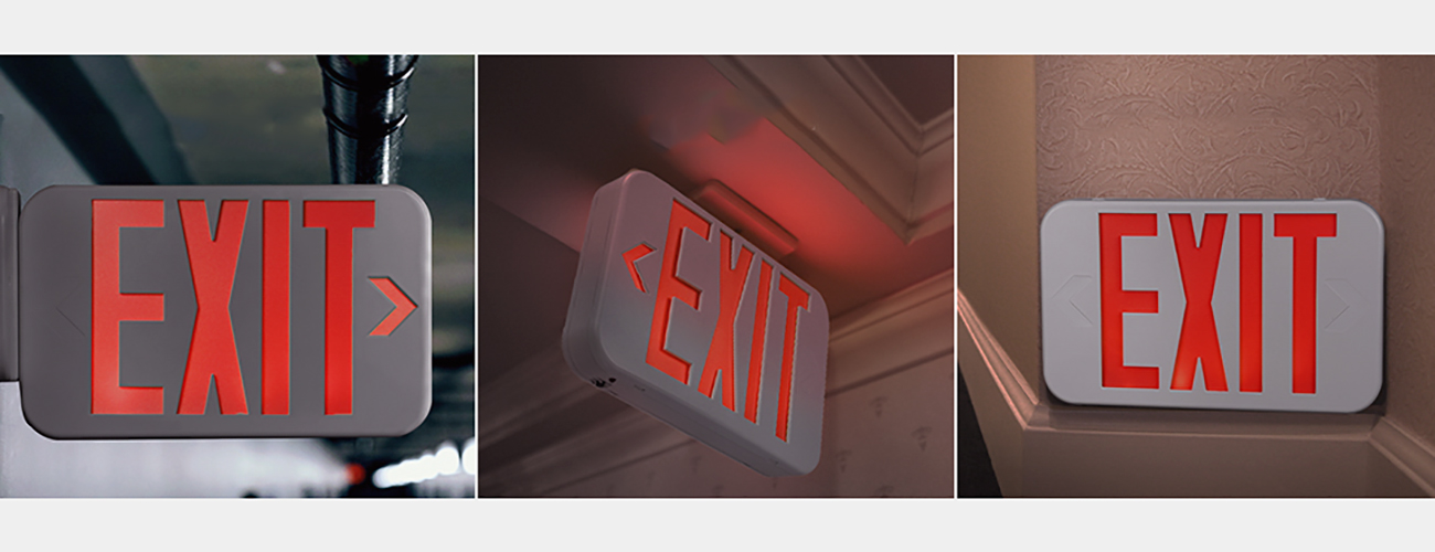 O săgeată stânga și dreaptă poate fi eliminată de pe placa de față pentru a indica direcția de ieșire. O suport de montare universală permite montarea ușoară din partea superioară sau a laturilor. Acest semn de ieșire este pre-asamblat și livrat pe o singură față cu o placă de ieșire suplimentară inclusă în casetă pentru ansamblul manual opțional.