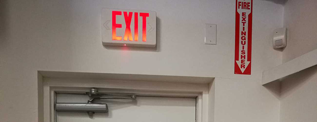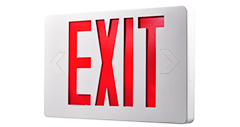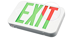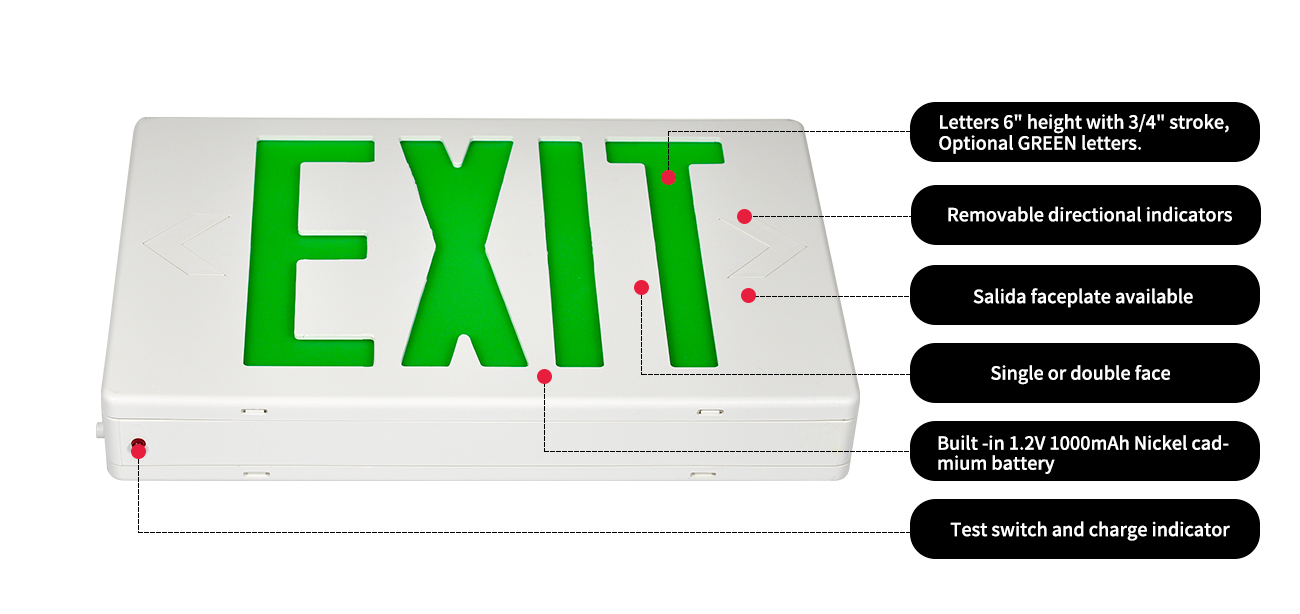 O săgeată stânga și dreaptă poate fi eliminată de pe placa de față pentru a indica direcția de ieșire. O suport de montare universală permite montarea ușoară din partea superioară sau a laturilor. Acest semn de ieșire este pre-asamblat și livrat pe o singură față cu o placă de ieșire suplimentară inclusă în casetă pentru ansamblul manual opțional.