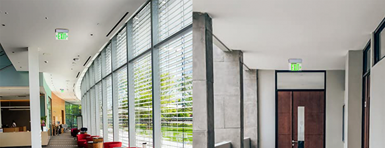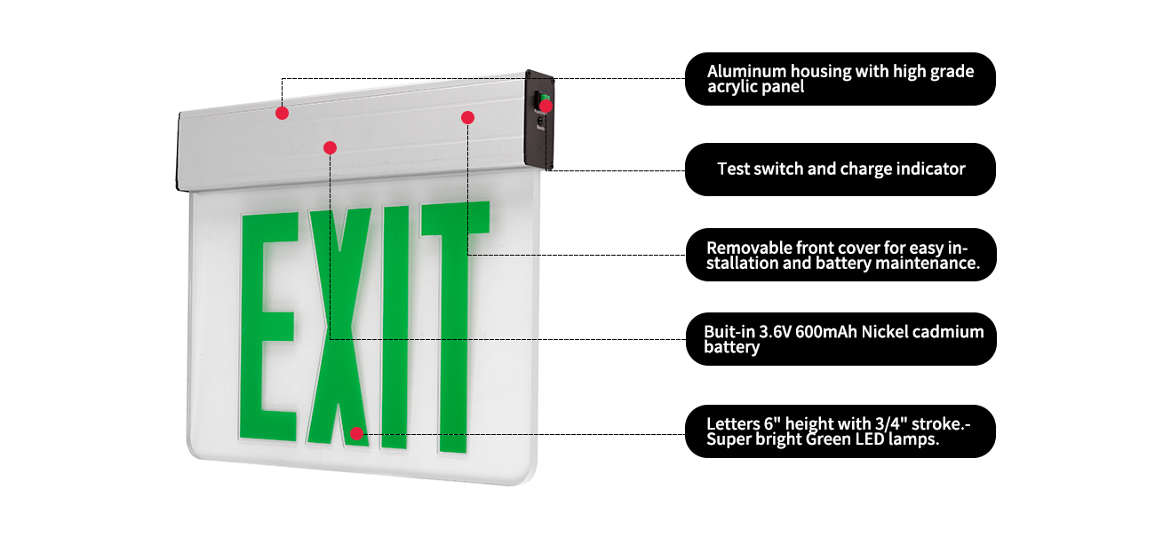 *Iluminare - Această serie de semne de ieșire Lit Lit oferă o iluminare cu LED -uri de viață. Unitatea este construită cu o placă LED cu ieșire verde.  Consumul de energie este evaluat la mai puțin de 3,5 wați pentru unitățile model de curent alternativ. Unități de rezervă a bateriei Consumul de energie este evaluat la mai puțin de 1 wați.