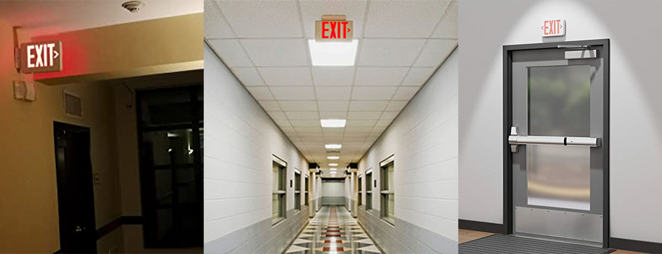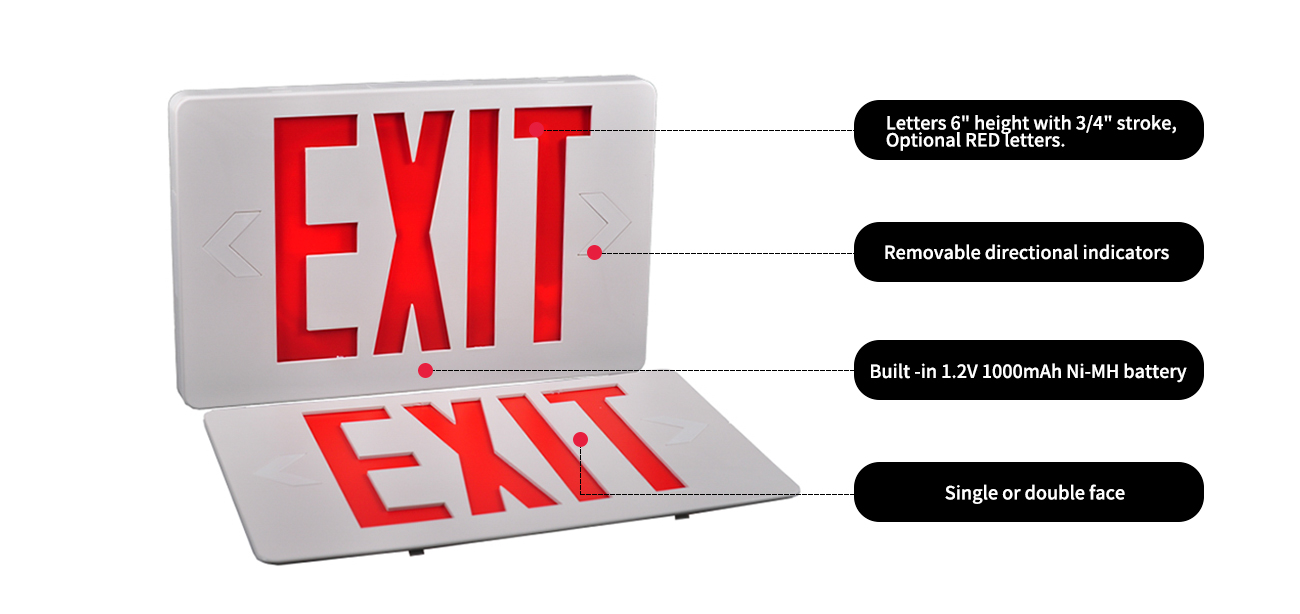 O săgeată stânga și dreaptă poate fi eliminată de pe placa de față pentru a indica direcția de ieșire. O suport de montare universală permite montarea ușoară din partea superioară sau a laturilor. Acest semn de ieșire este pre-asamblat și livrat pe o singură față cu o placă de ieșire suplimentară inclusă în casetă pentru ansamblul manual opțional.