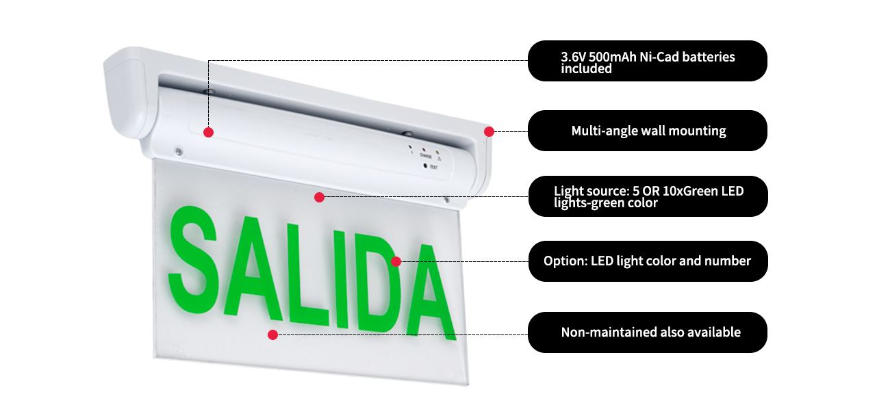 *Backup pentru baterie de urgență-semnul de ieșire LED este proiectat cu o baterie Ni-CAD de 500 mAD de 3,6 V de întreținere, care oferă o durată de urgență minimă de 6 ore. Timpul de reîncărcare a bateriei este de 24 de ore.