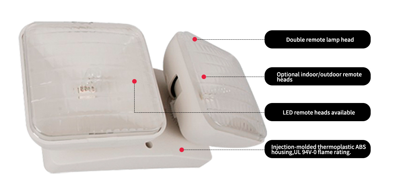 Acasă / Produs / Lumina de urgență / Cap de la distanță LED de urgență de urgență / JRH-2-UL 94V-0 rating Flame Capes dublu lampă de la distanță